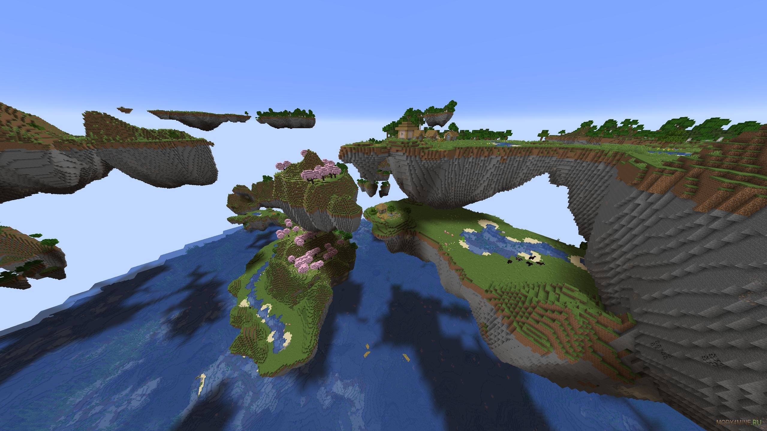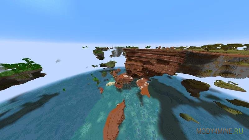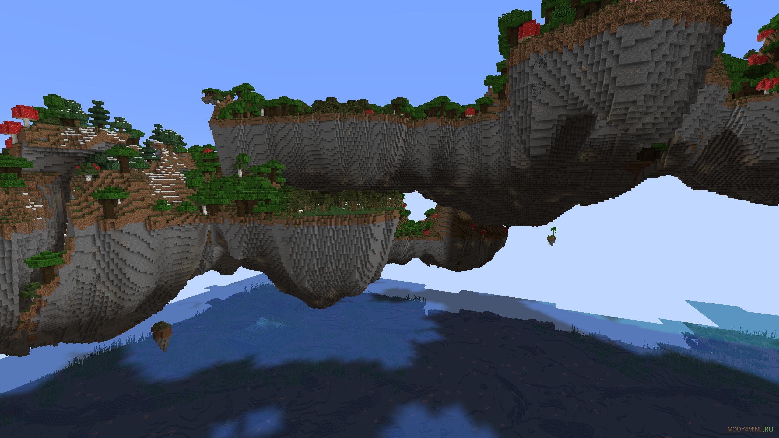Биомы поделены на кусочки парящей земли, возвышающиеся над бескрайним океаном. Под ним располагаются пещеры с рудами. Придётся заняться строительством лестниц или лифтов. Материалы ограничены, но не сведены до нечестного минимума. Создатель вдохновлялся небезызвестной классической модификацией Aether. Проходить игру в подобных условиях определённо любопытно.