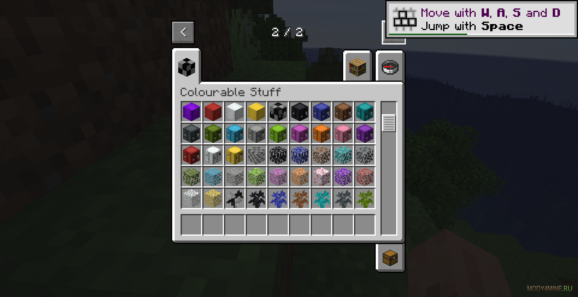 Особое преображение окружения по стандартным правилам. Мод Colourful Trees Stone And Water добавит перекраску блоков ванильными красителями. Отсутствие данной особенности, хотя бы в креативном режиме, достаточно огорчает многих дизайнеров. Теперь можно будет приукрасить множественные строительные материалы, сделав мир ярче.