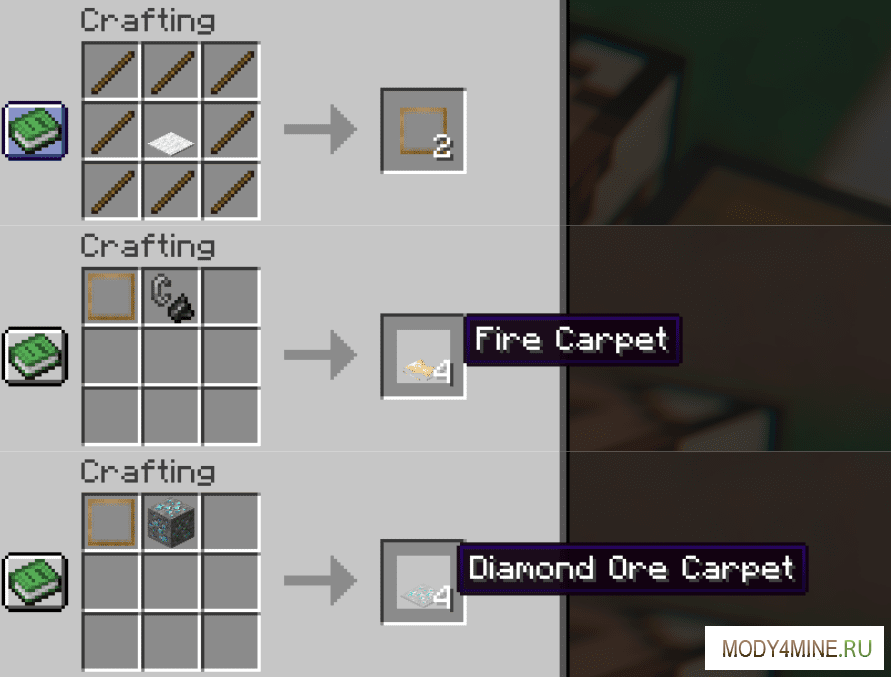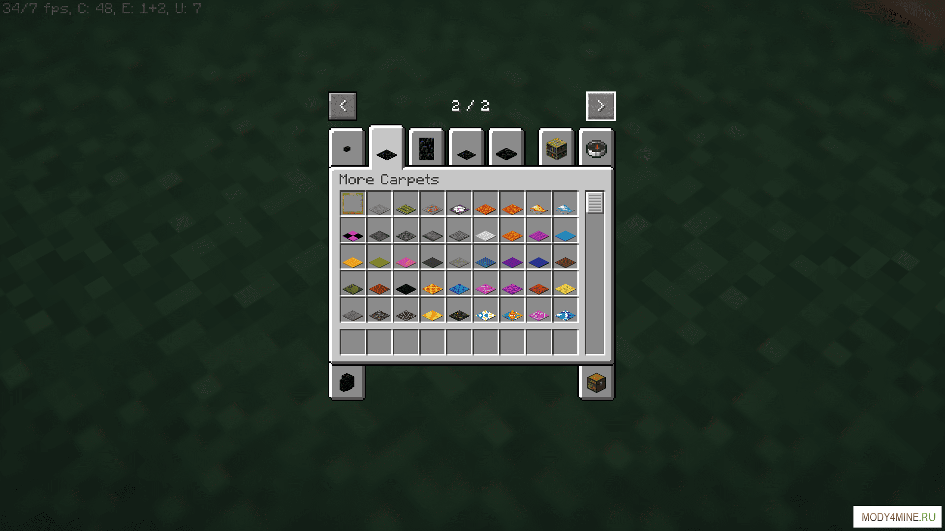 Разнообразие в украшении поверхностей. Мод More Carpets добавит новые ковры, создаваемые из любых видов блоков. Для обыкновенной конвертации кубов в плоские листы понадобится скрафтить древесную рамку. Недорого, практично, большая вариативность для преображения интерьеров или обустройства внешнего окружения построек.