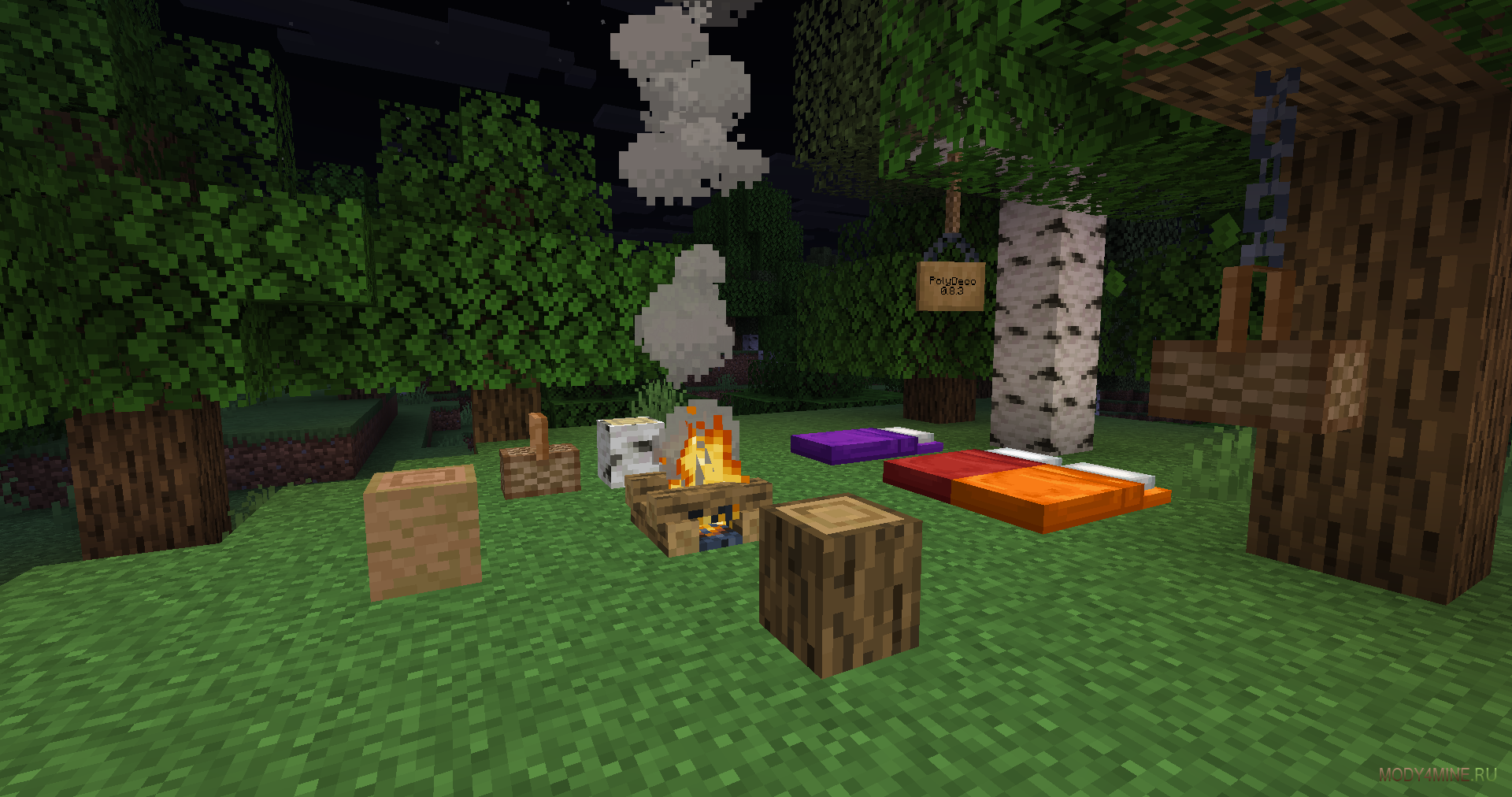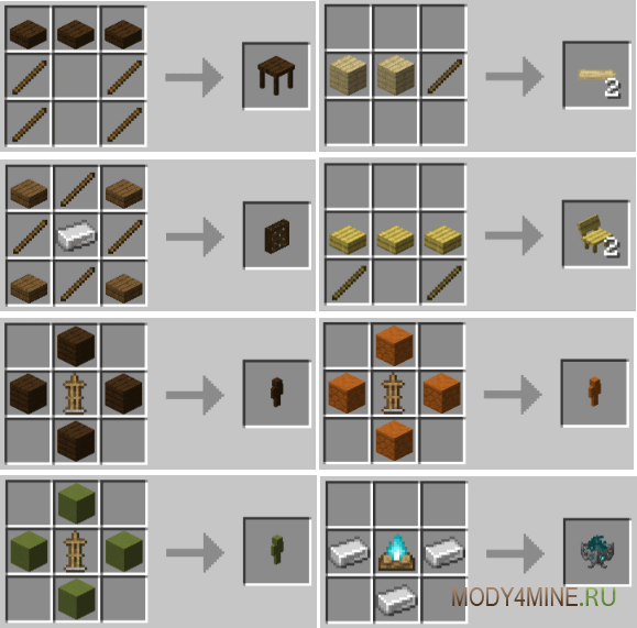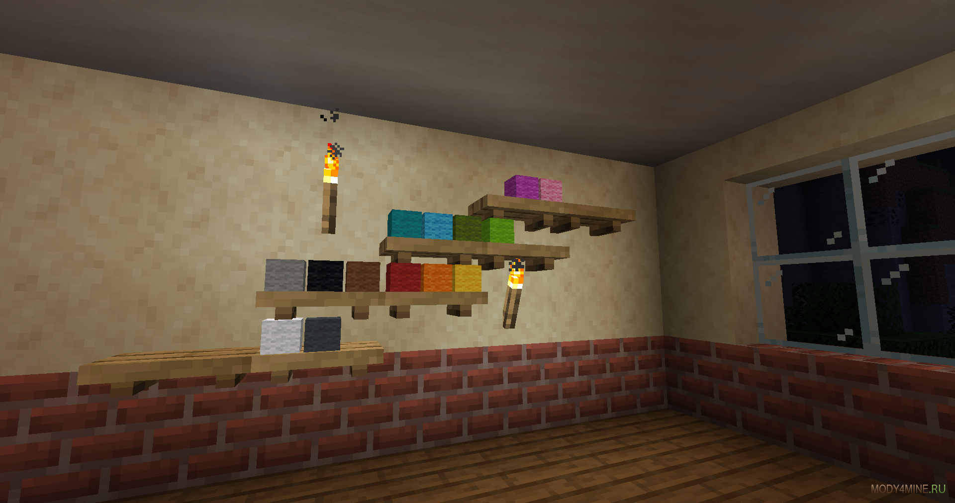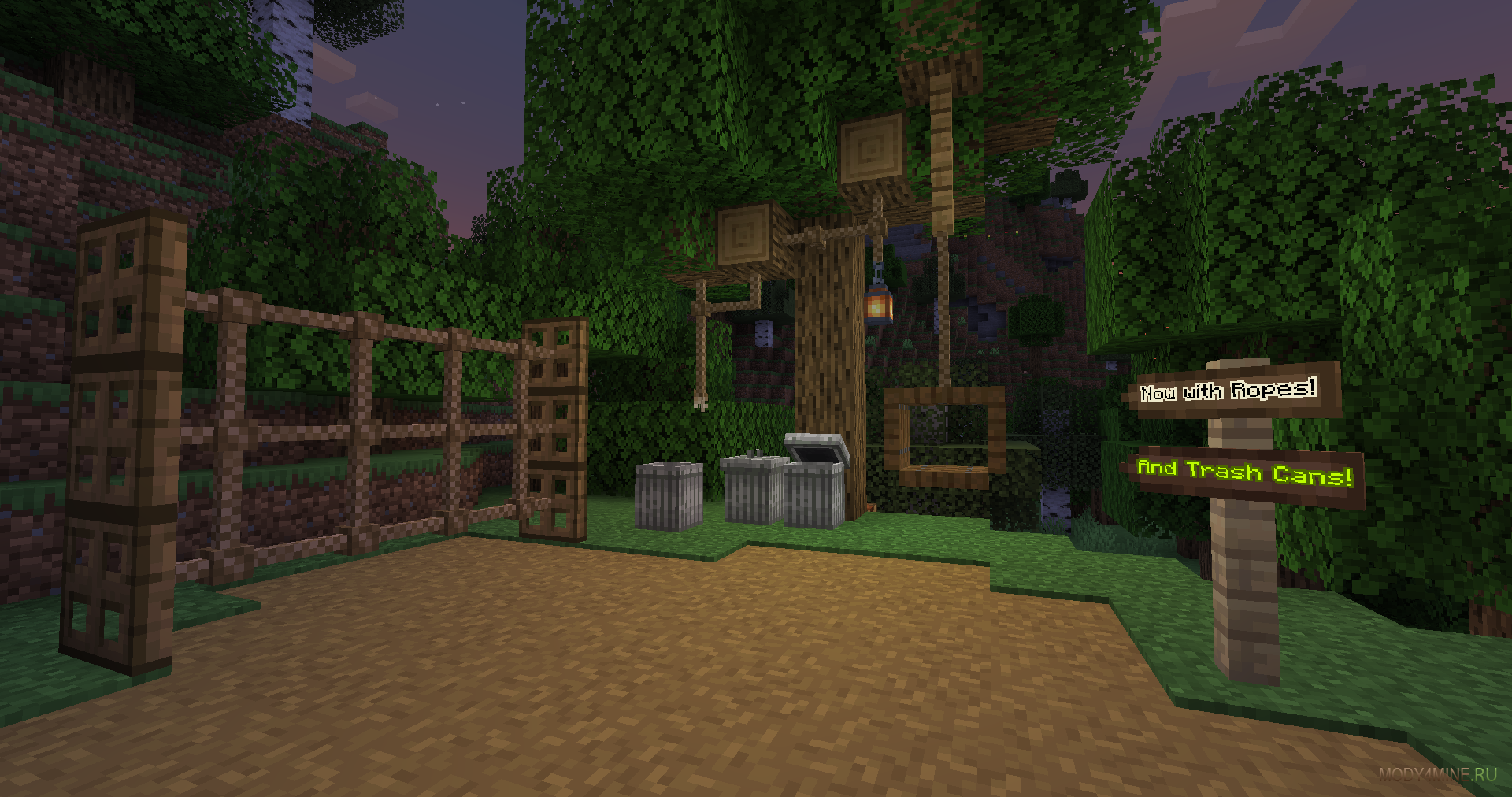 В комплект входит пара новых инструментов, столы, стулья, скамейки и прочее из ванильных типов древесины. Обновлённые человечные манекены, почтовые ящики, полочки для хранения блоков с вещами. Урны, глобусы, огненные чаши, горшки для растений, витрины и остальное. Масса интересных нововведения для изучения и уютного обустройства жилища.