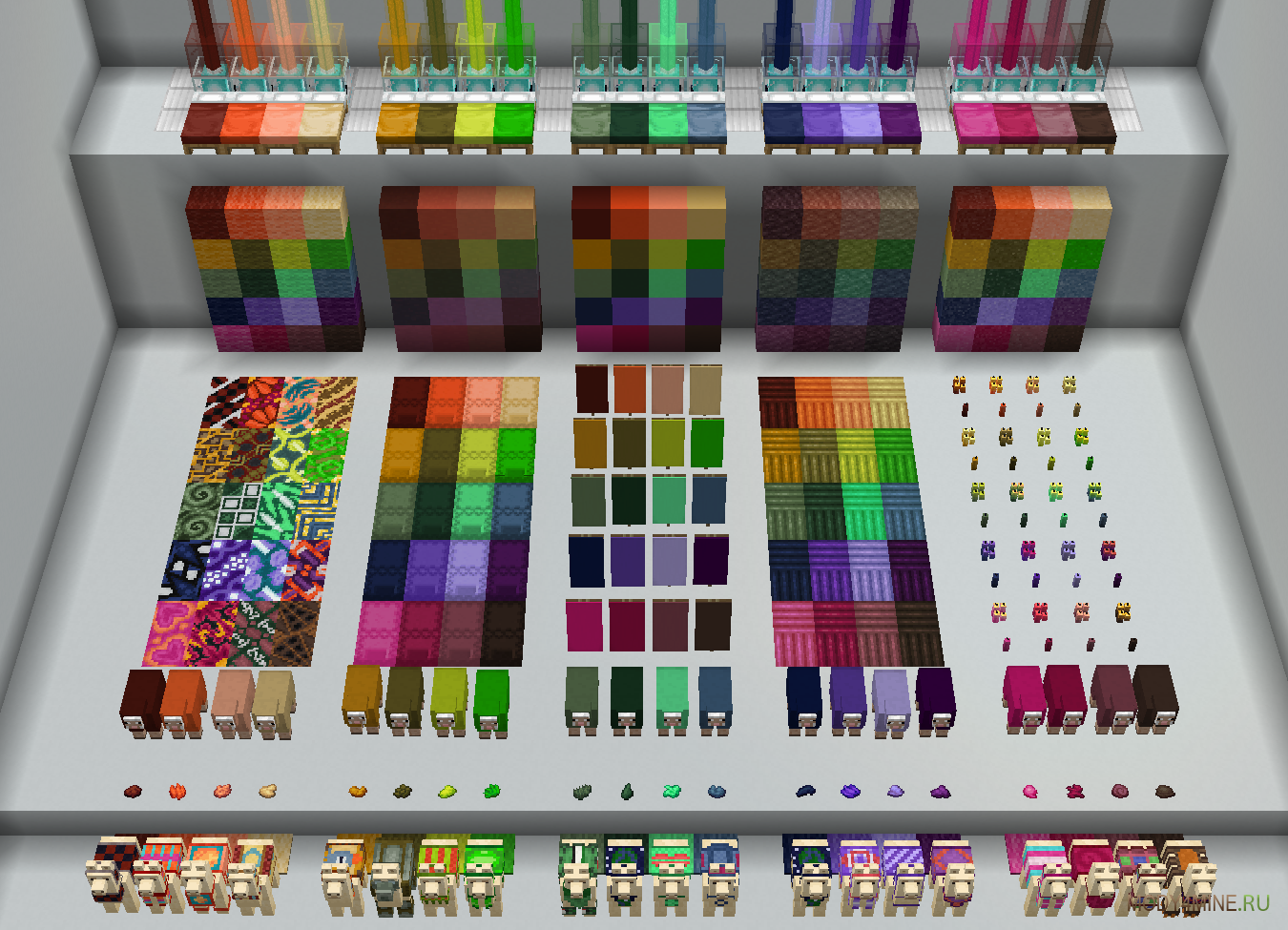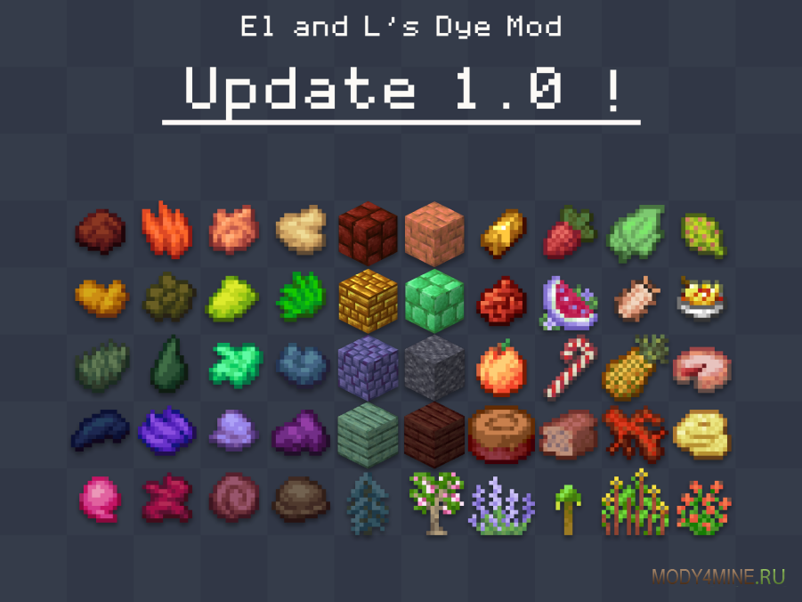 Стройте красивые пиксель арты из большей палитры. Мод El And L’s Dyes добавит новые красители, а также растения, еду и блоки, в качестве источников. Команда авторов решила разнообразить ванильные краски оттенками, но сделать это не обыкновенным смешением порошков или ресурсов из неоткуда. В природе встретится ранее невиданная растительность, а также узорчатые кубы для строительства.