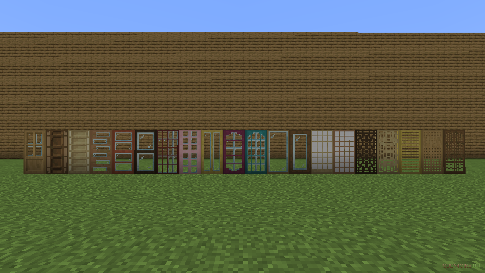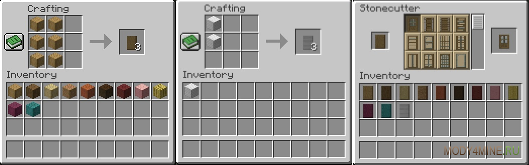 Двадцать разновидностей, с окошечками, резными оформлениями, бумажные, закрытые, сетчатые и остальные. Представлены в одиннадцати ванильных оттенках древесины. Могут быть скрафчены из обтёсанных блоков и железных кубов. Оформление экземпляров меняется на резчике камней. Декорируйте здания в комфортном антураже, делая проходы компактнее и уютнее.