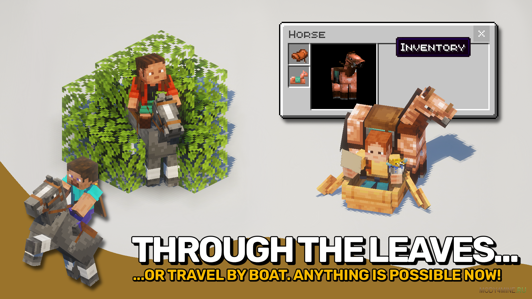 Никакого выбрасывания из седла при пересечении водоёмов. Проход сквозь листья, отключения разгуливания оседланных, ускорение при спринте. Открытие инвентарей персонажа или сумок по двойному клику, включение прозрачности при просмотре земли. Можно держать карты и одновременно двигаться, активация коллизий для пассажиров (не застревают в блоках, медленно погибая). Крадитесь + ПКМ для вытаскивания мобов из сидений. Нововведений гораздо больше, с затрагиванием фиксов мелких багов.