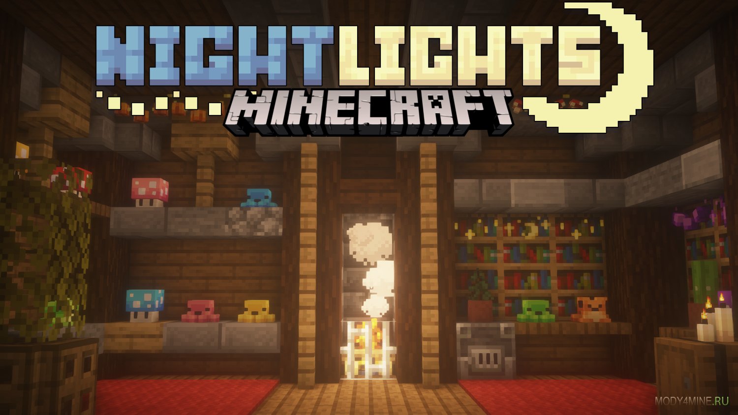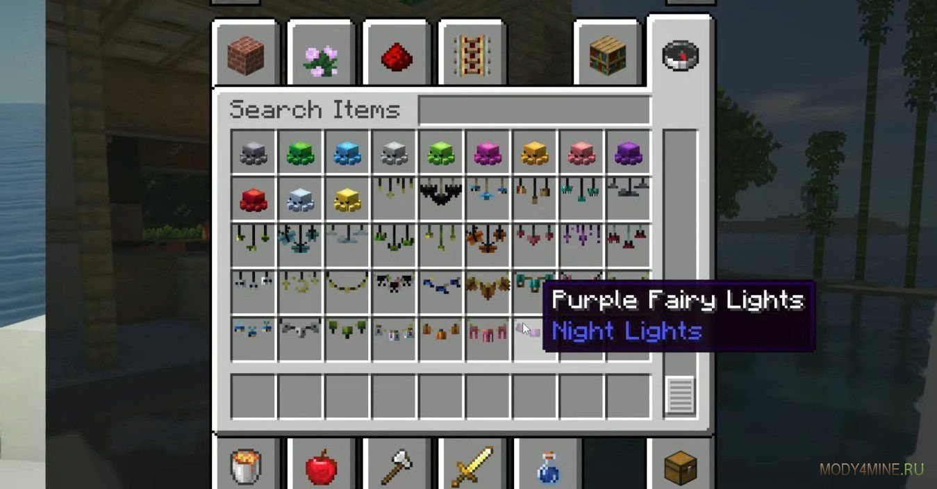 Большой наоборот красивого декора для создания уюта. Мод Night Lights добавит множественные элементы декоративного освещения, включая гирлянды и ночники. Идеальны для преображения атмосферных вечеров или ночей. Функционируют без подсоединения цепи редстоуна, не требуют дополнительного питания. Крафтятся в режиме выживания из стандартных материалов.