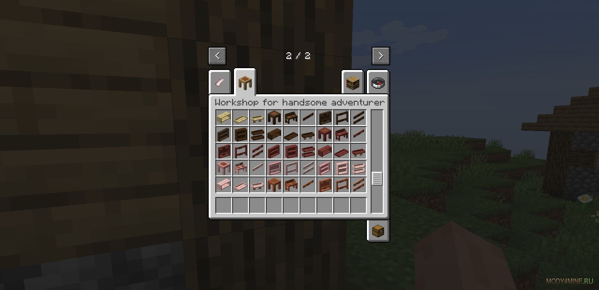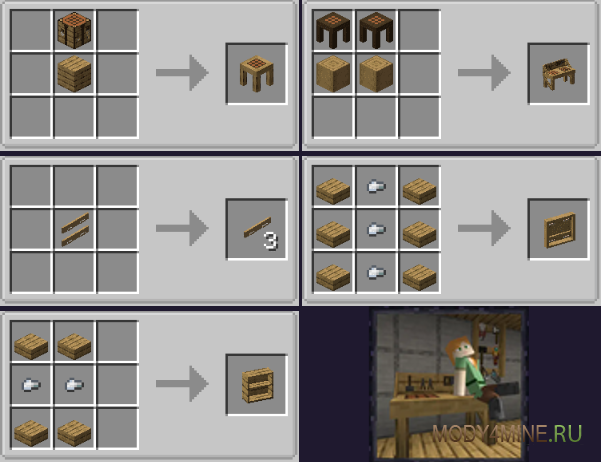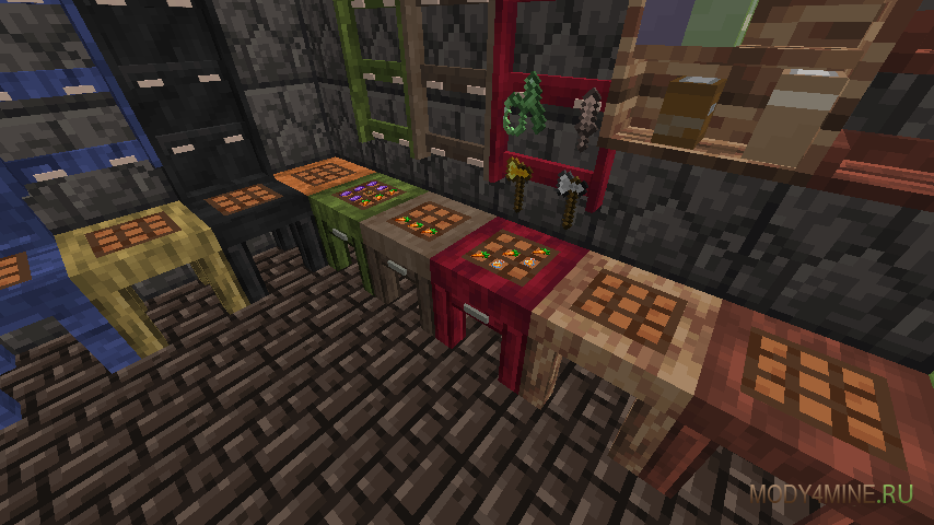 Верстаки с остающимися разложенными вещами, а также двумя сетками для рецептов. Настенные хранилища, работающие на ПКМ и позволяющие хранить инструменты, оружие и прочее. Полочки для зелий или пластинок, компактные, приятные. Книжные шкафы, с более удобной интеракцией, в отличие от официальных из 1.20. Доски для задач, на них крепятся любые ресурсы, материалы и остальное.