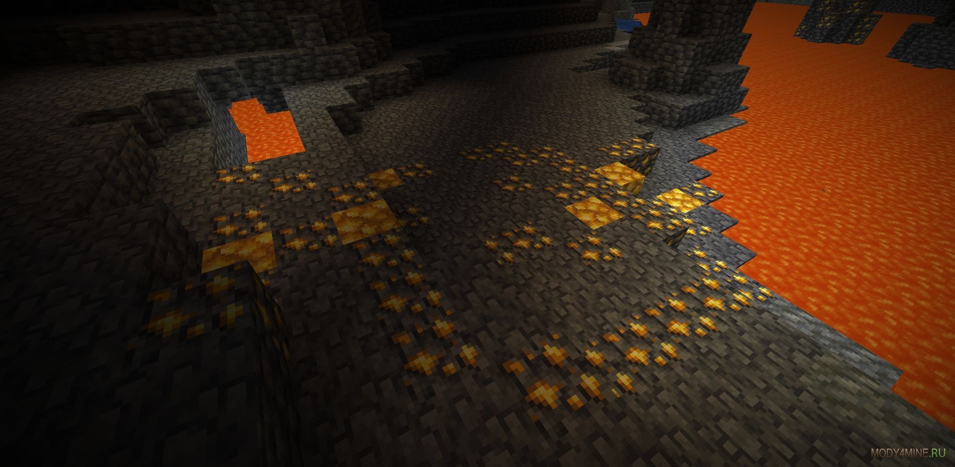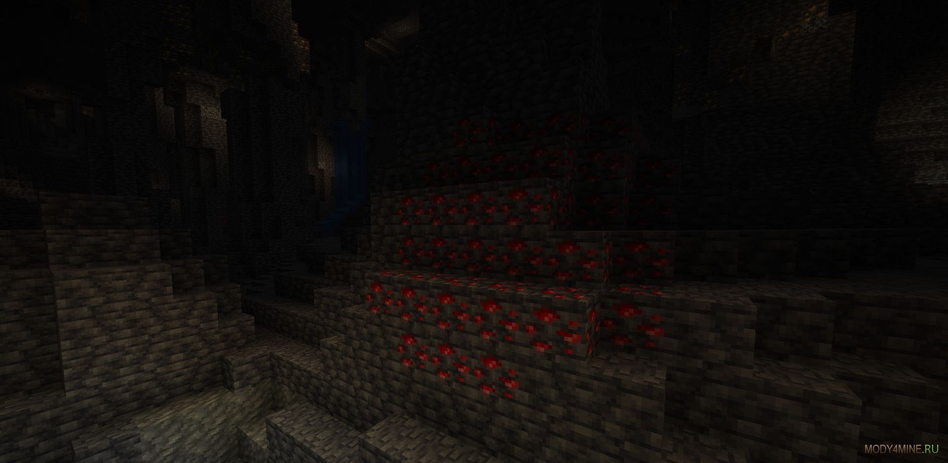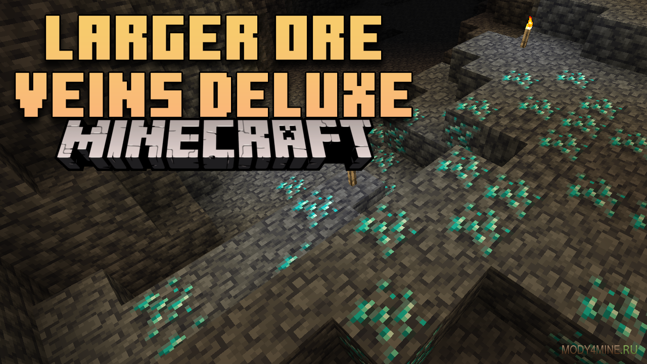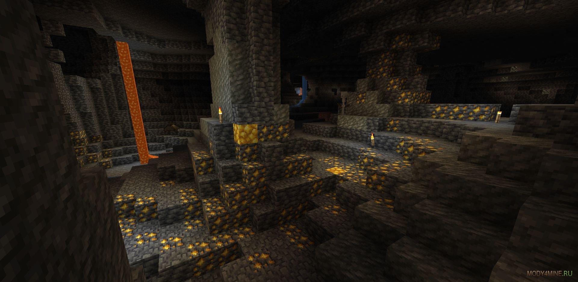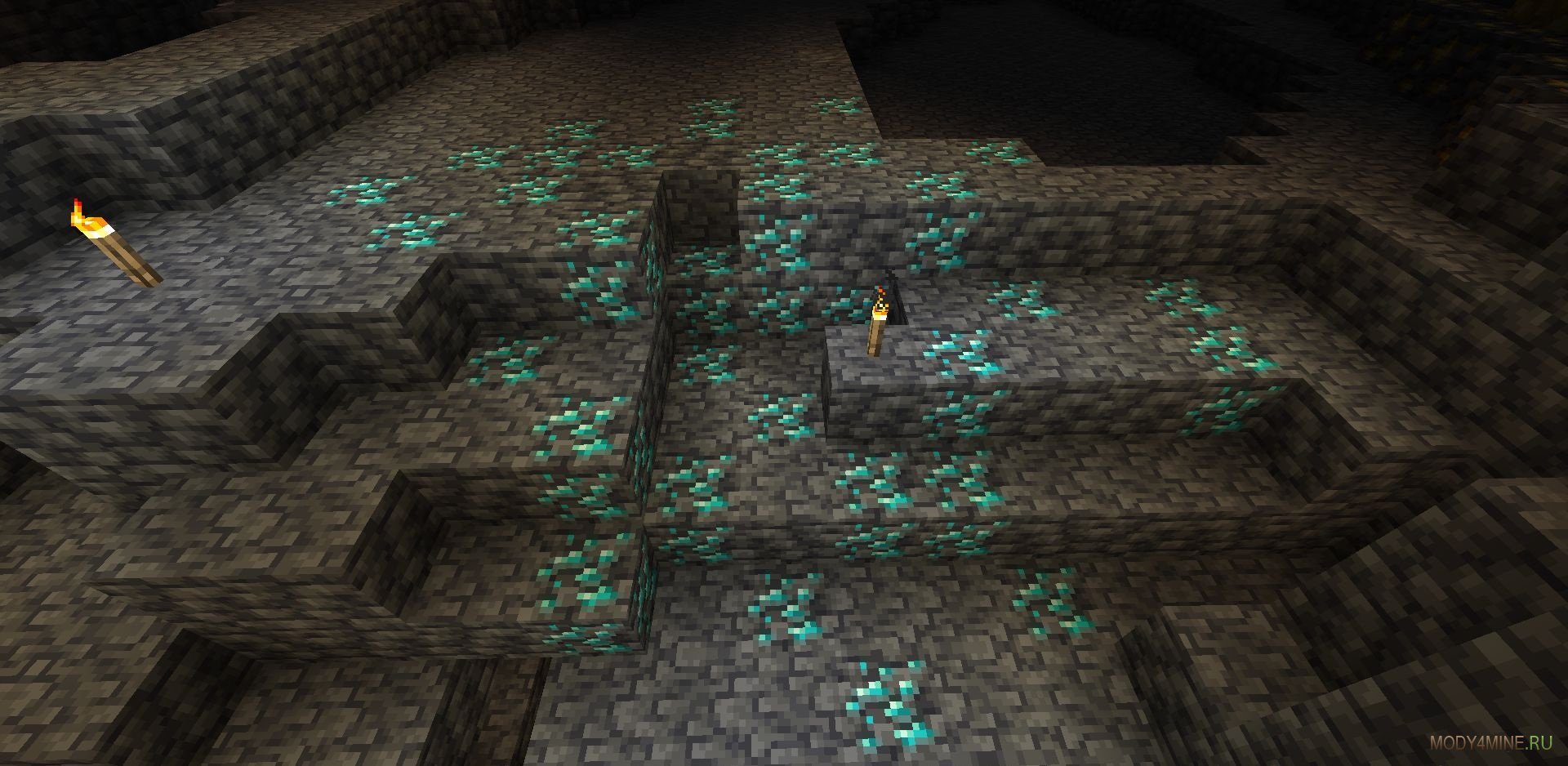 Походы в шахты приятно удивят и наградят исследователей. Мод Larger Ore Veins Deluxe добавит генерацию больших залежей руд и минералов для более выгодной добычи. Стандартное изменение параметров генератора через простой скрипт, однако данный вариант сборки объединяет классический, алмазный и адский паки в цельное нововведение.