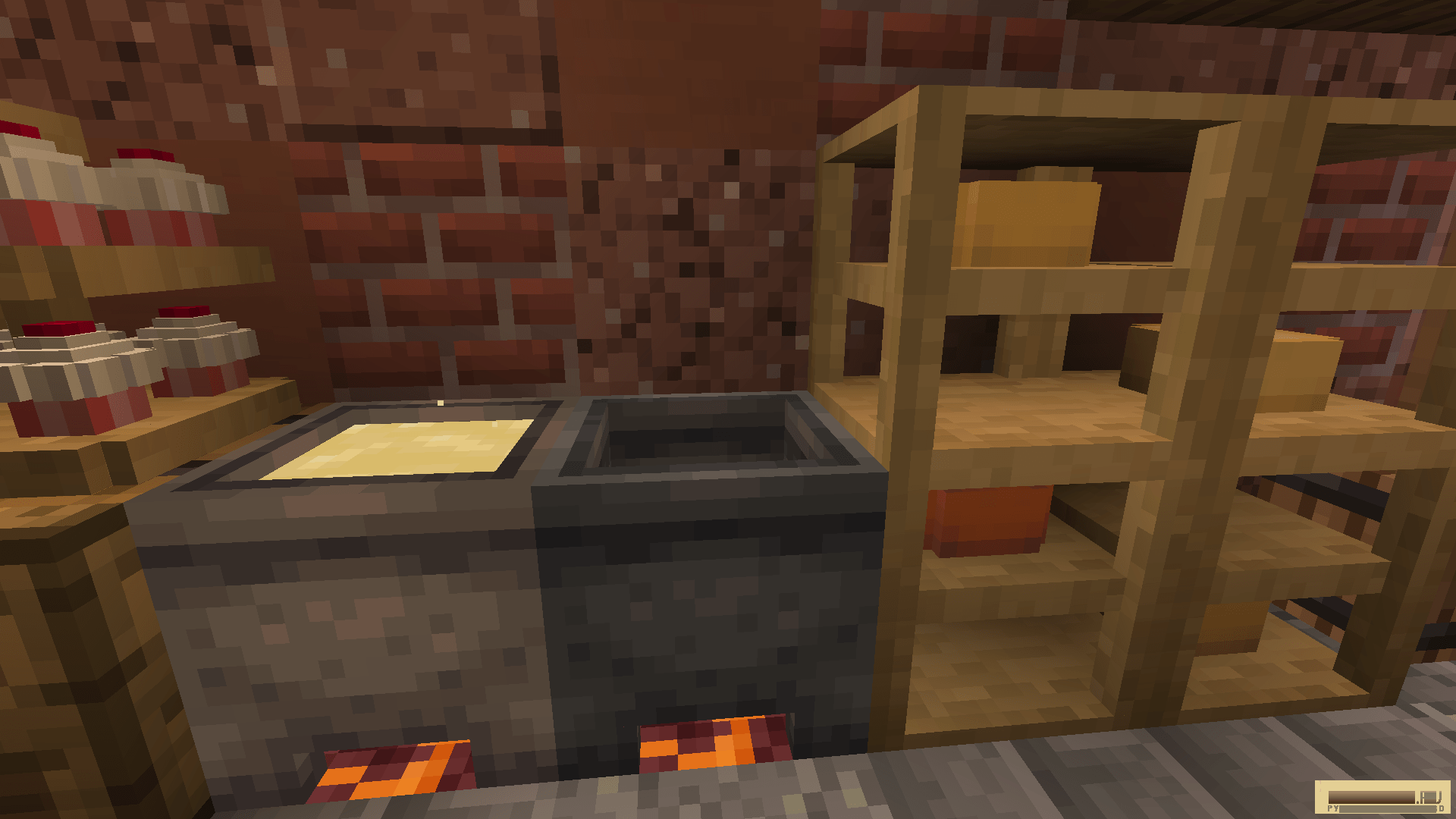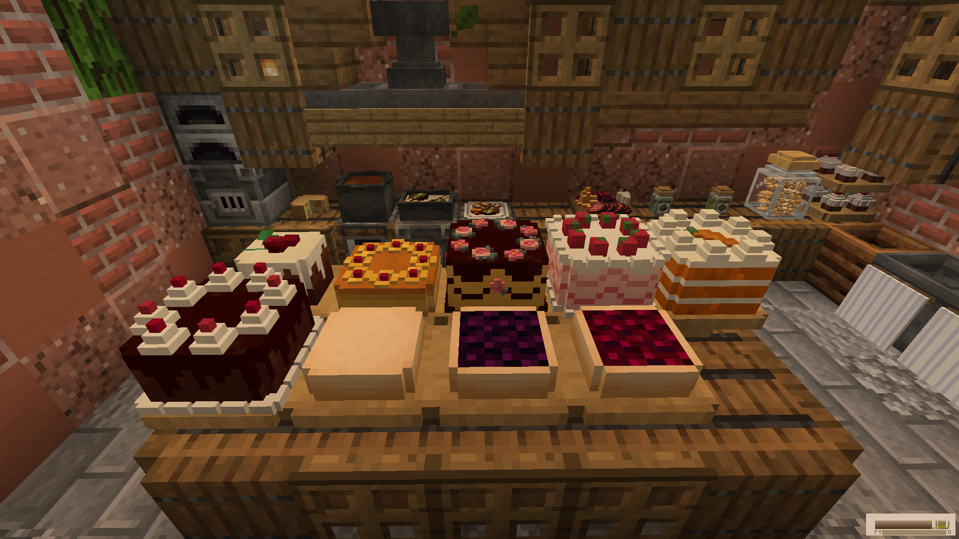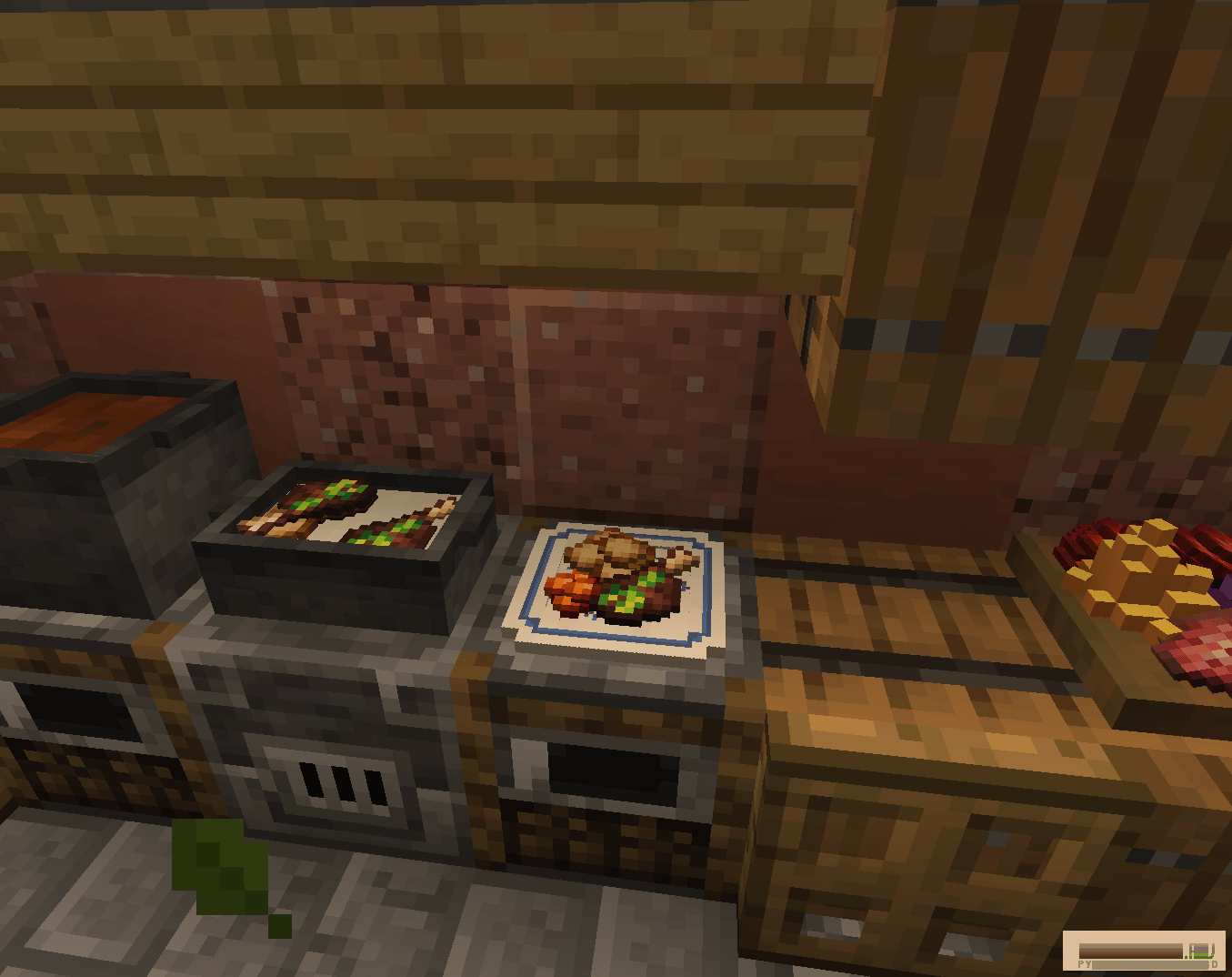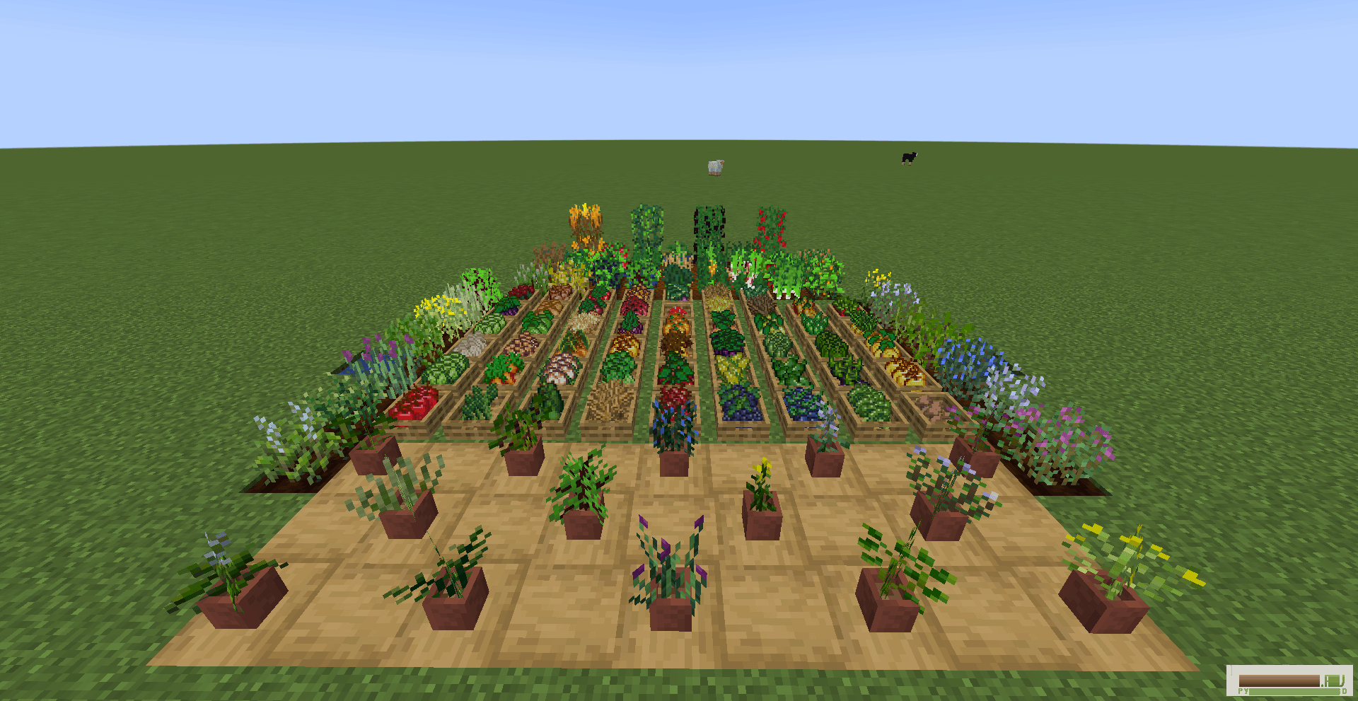 Тридцать две выращиваемых культуры, восемь фруктовых деревьев, четырнадцать вариантов собираемой зелени. Корзинки, горшочки, шкафчики. Семена можно отыскать в любых ванильных сундуках структур, а древесные типы встречаются в случайных биомах. Все рецепты автоматически включены в стандартную книгу помощи по крафту. Готовьте вкусности на обновлённой кухне, размещая тарелки с кастрюлями на столах.