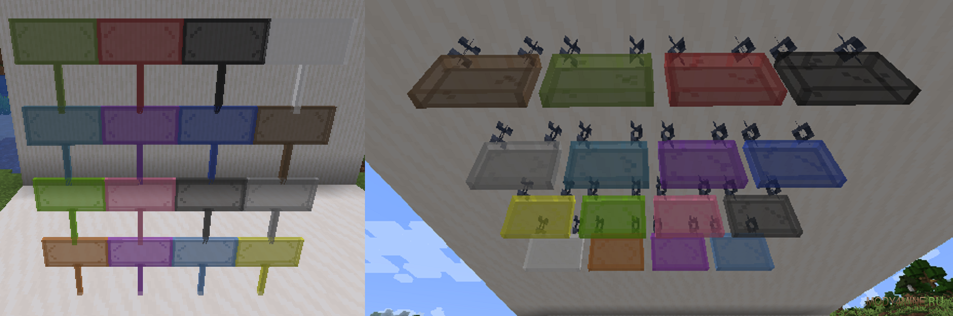 Шестнадцать стандартных оттенков, применение мембраны фантома для создания подсвечиваемых надписей. Новые предметы имеют отдельный тег для удобной интеграции в команды. Применяйте часть моба на тексты, крафтите красивые разновидности оконных подписей, украшайте ими названия магазинов, заведений и прочих локаций.