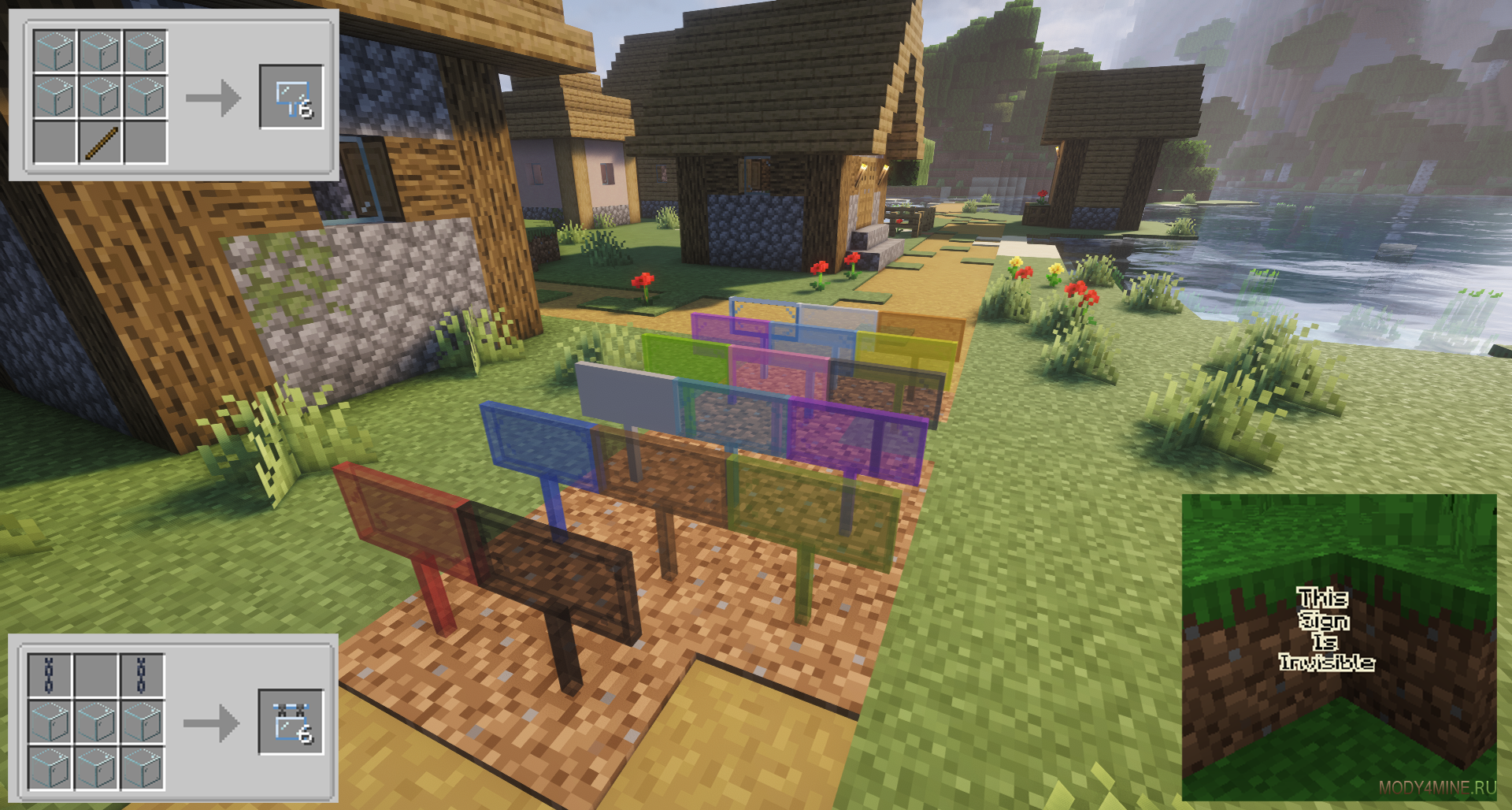 Фрагмент украшения для входов в здания. Мод HoloSigns добавит стеклянные прозрачные таблички, включая подвесные, а также невидимые варианты. Приятный и простой элемент декора с классическим рецептом. Подойдёт для современных типов помещений, при подсветке создаёт иллюзию неоновых вывесок. Полное ванильное сочетание, возможность комбинирования.